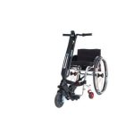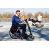 La handbike Blumil Go se conecta con el eje de la silla de ruedas e inclina el respaldo hacia atras colocando el reposapiés de la silla sobre la plataforma de suelo de la handbike.