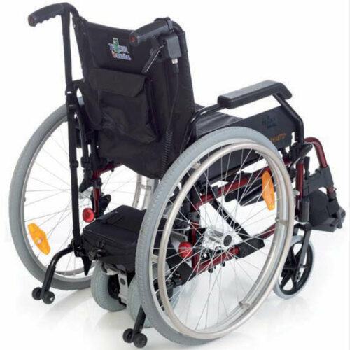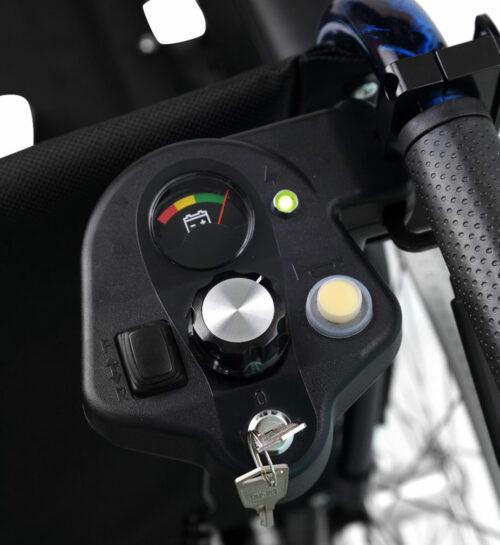 Con la palanca que se instala en la empuñadura de la silla de ruedas, el acompañante empuja la silla con muy poco esfuerzo. En el mando podemos encontrar el indicador de batería, el selector de marcha hacia delante o hacia atrás, el control de velocidad y la bocina.