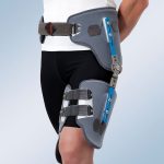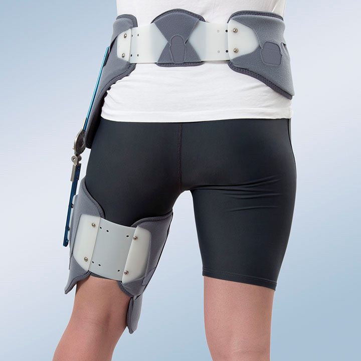Ortesis estabilizadora de cadera modular que puede ser utilizada indistintamente para la cadera izquierda o derecha. Fabricada en polietileno de baja densidad. Compuesta por una banda pélvica y una muslera (ambas bivalvas), unidas entre si por una articulación regulable en flexo-extensión de 0° a 90° en intervalos de 10° y en abducción, en las posiciones de 0°, 15° y 30°. Los cierres de la muslera están compuestos por dos cinchas con cierre de velcro. La muslera permite modificar la rotación y la altura de la almohadilla condilar para conseguir una perfecta adaptación. Tanto la banda pélvica como la muslera, se deslizan a lo largo de las pletinas de la articulación para acomodarlas a la altura del paciente. Los cierres de la muslera están compuestos por dos cinchas con cierre de velcro y la banda pélvica se ajusta mediante un cinturón de velcro. El forro interno de foam y el externo de velour cubren el plástico de la ortesis protegiendo al paciente de posibles rozaduras con las partes rígidas de la misma, estas partes textiles son fácilmente desmontables y lavables, lo que permite una correcta higiene de la ortesis.