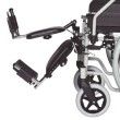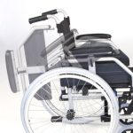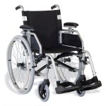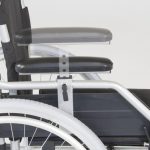 Silla de ruedas fabricada en acero con ruedas antipinchazos de poliuretano. Los reposabrazos son abatibles y regulables en altura para adecuarlos a la altura del paciente. Los reposapiés son desmontables y ajustables en altura.